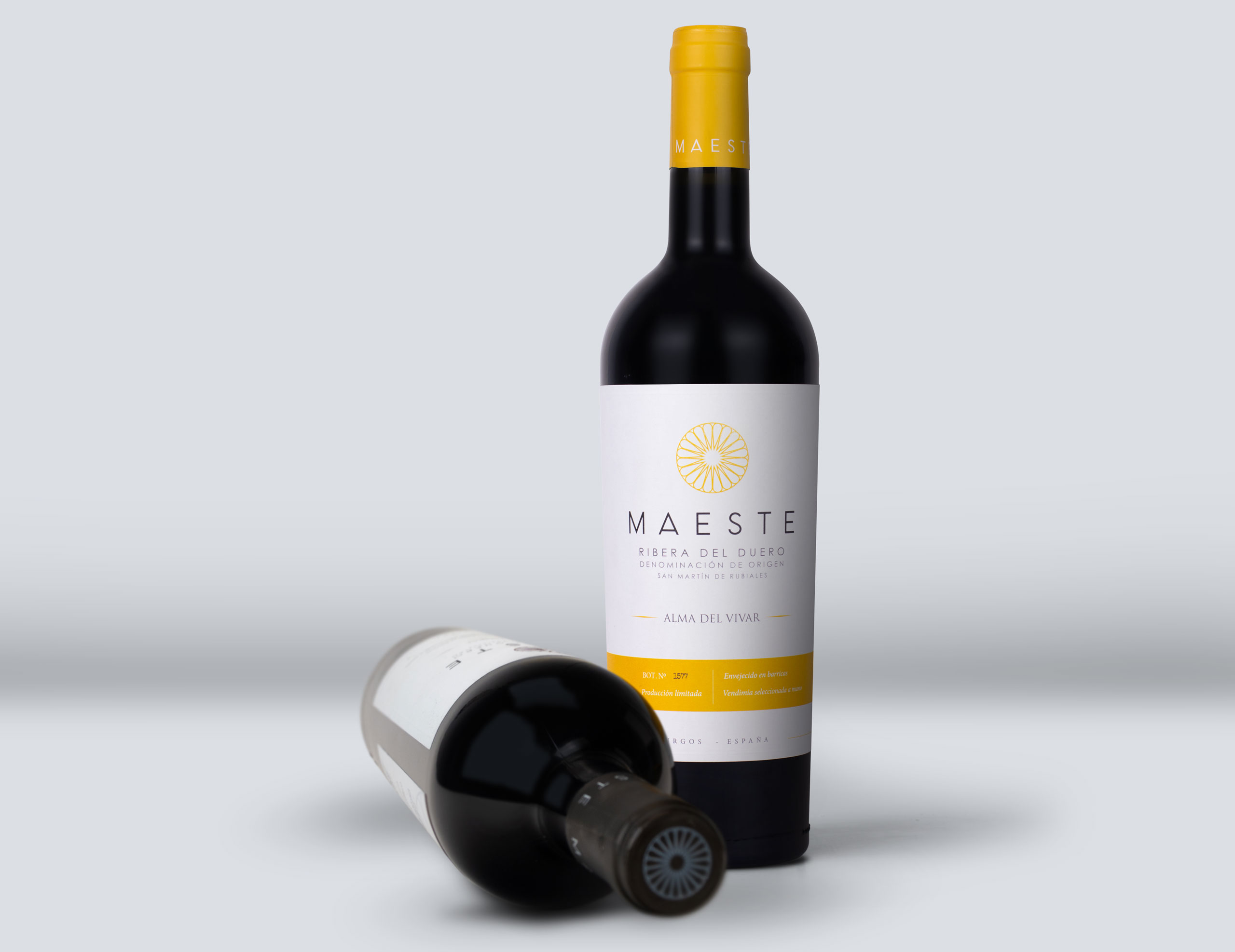 Tras la creación de toda la marca y su manual, vimos claro que el diseño de la etiqueta del vino tenía que tener el carácter propio de Bodegas Maeste: Un diseño claramente identitario, con el uso del color principal de la marca, un mostaza que aportara viveza a una etiqueta que, por el vino que tenía en su interior y todo el trabajo estratégico que realizamos con anterioridad, debía ser sobrio.