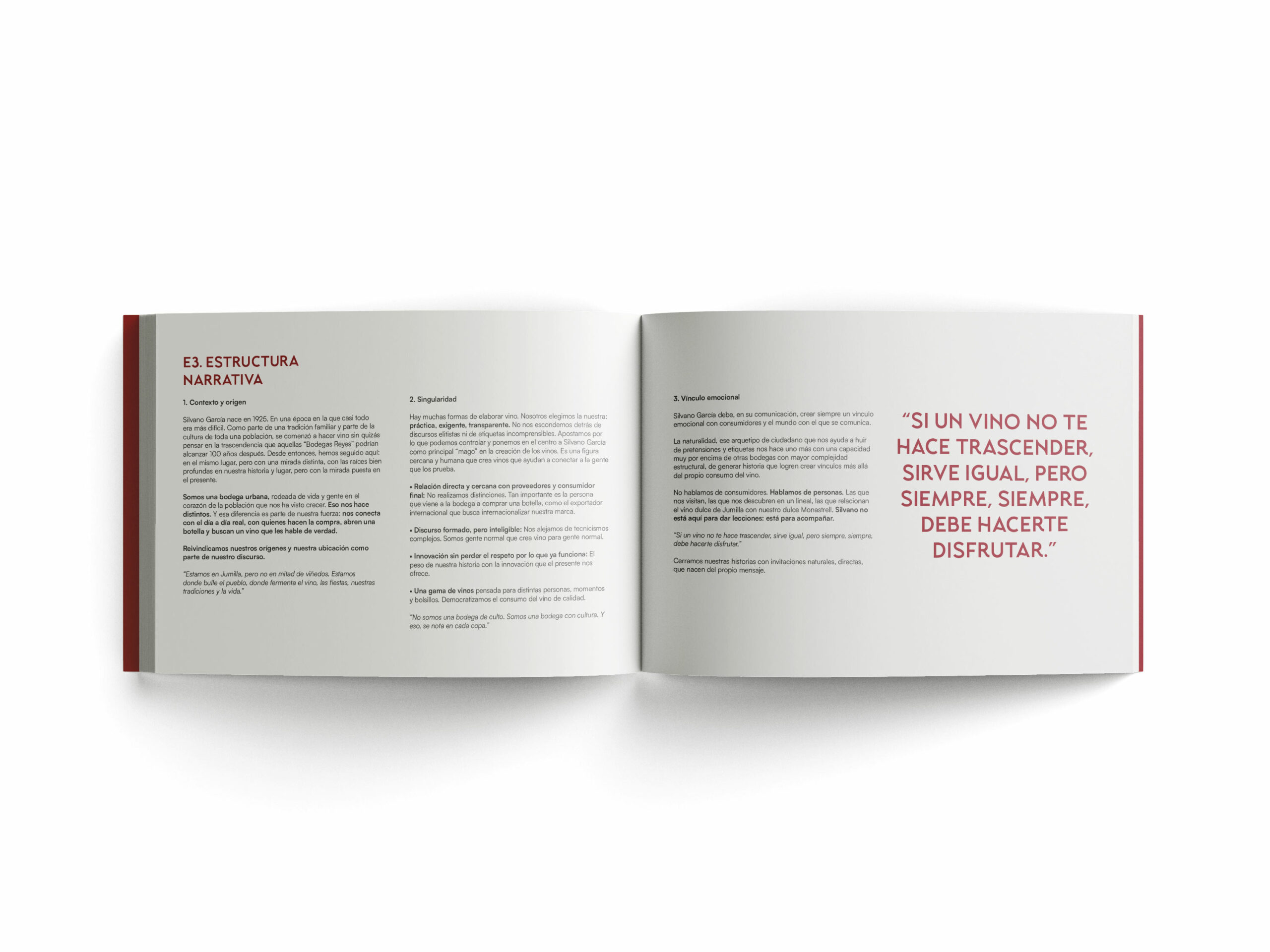 Planteamos su paradigma de marca e identidades verbal y actitudinal antes de pasar al visual. Silvano García es una empresa con un claro espíritu familiar que además cuenta con la ventaja de encontrarse en el centro urbano de Jumilla. Para darle un punto extra de valor, usamos el concepto de “Bodega Urbana” como una clara declaración de su propia identidad.